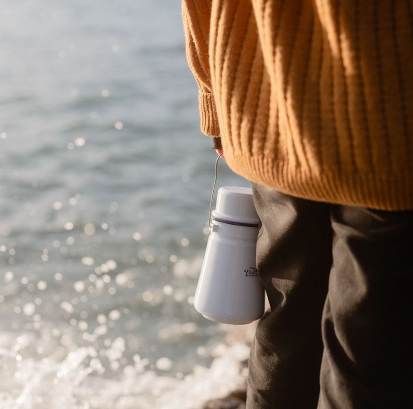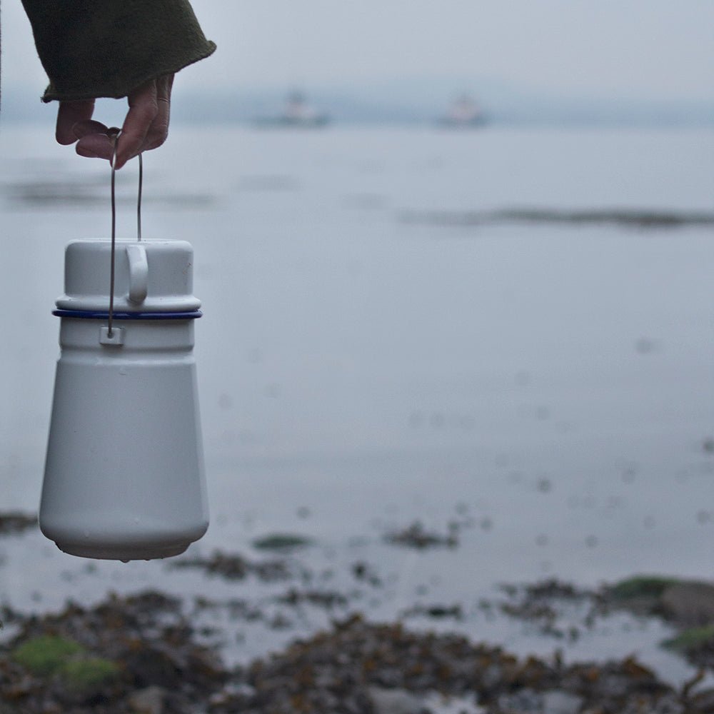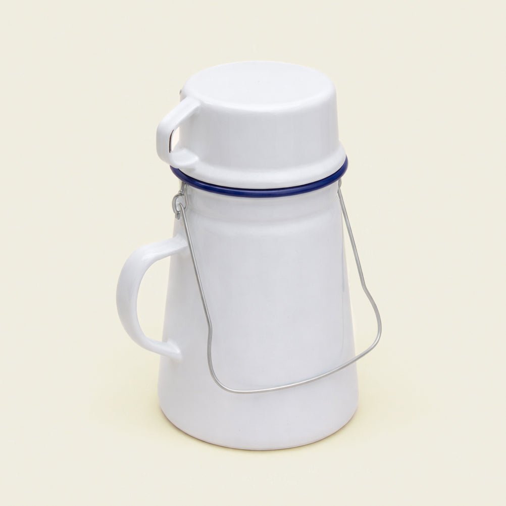 Classic blue and white enamel tea caddy with wire handle, the perfect hot chocolate accessory.